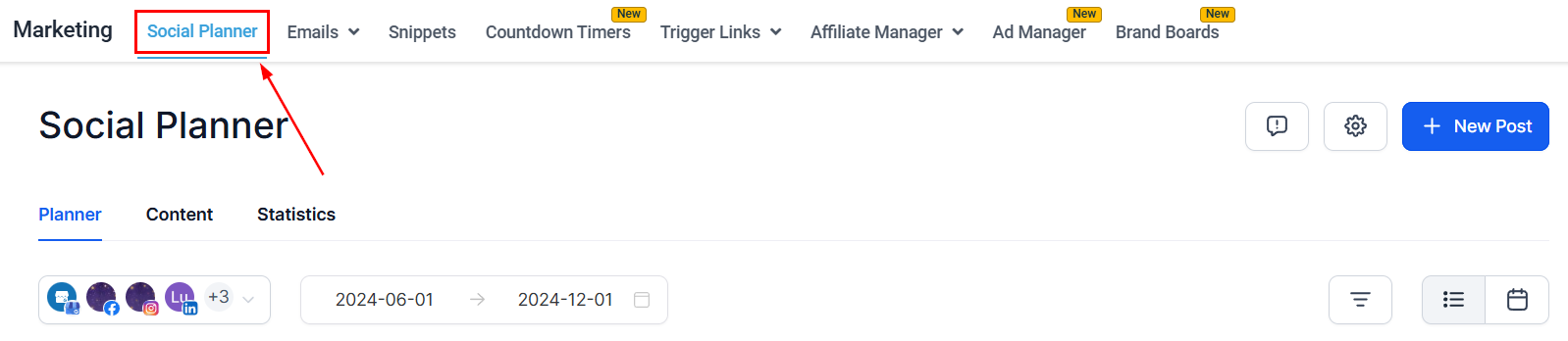 Begin by accessing the Social Planner section within the Marketing tab of your dashboard.