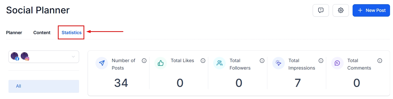 The Social Planner Statistics feature offers valuable insights into the performance of your social media posts, enabling you to analyze and optimize your social media strategies. This tool allows you to track key metrics across various social media platforms. By leveraging these insights, you can better understand what content resonates with your audience and refine your social media approach for greater engagement and reach.