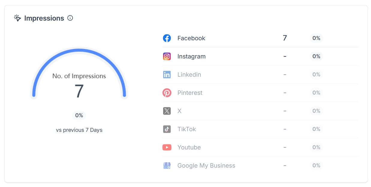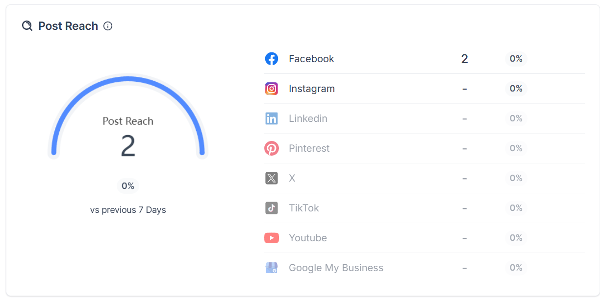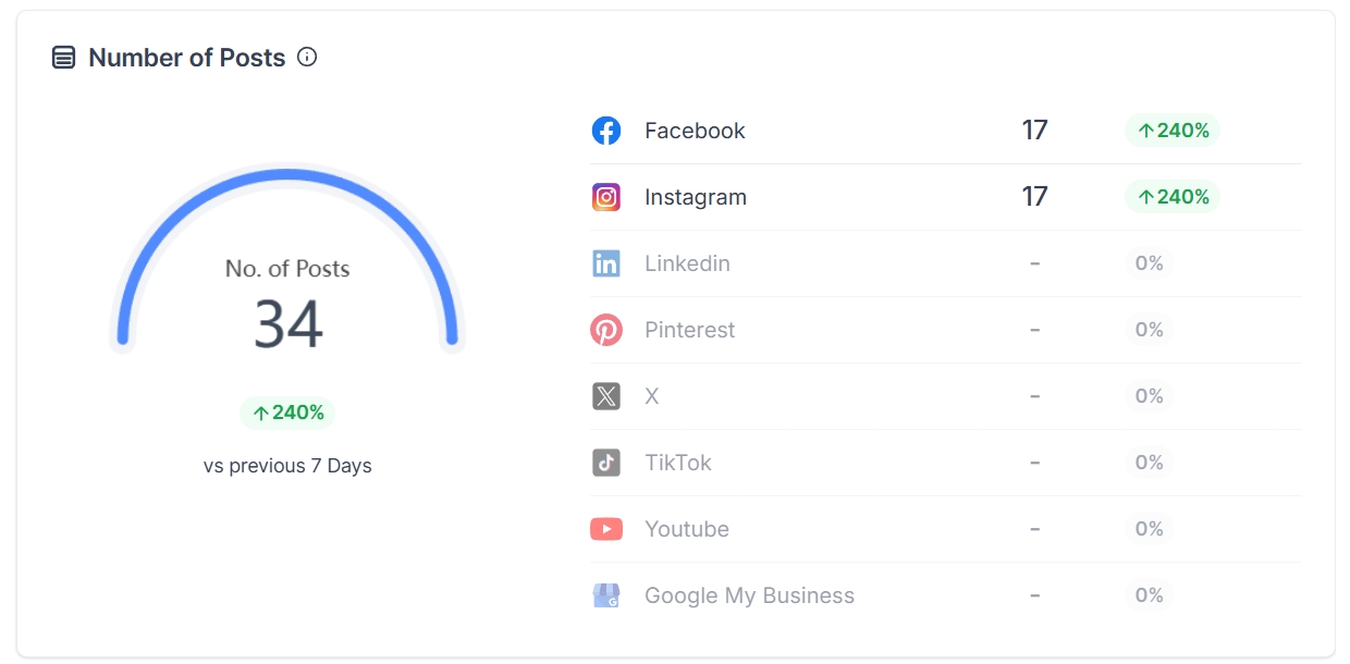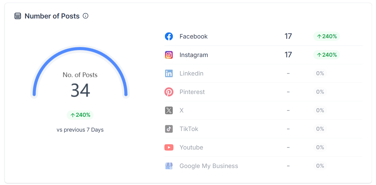 Number of Posts: This view allows you to monitor the total published posts across your connected social media accounts in the last 7 days.