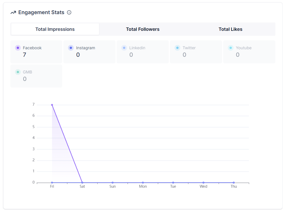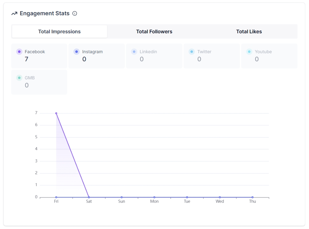Engagement stats: This view is a line chart that depicts daily impressions, followers, and likes.