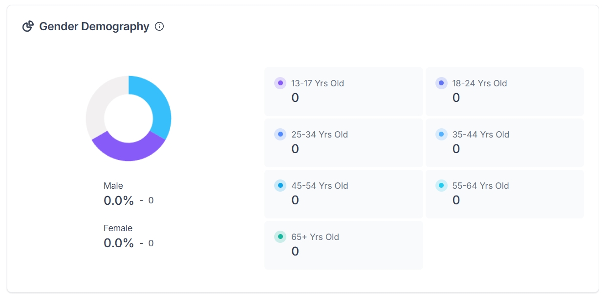 Gender Demography: This view will give you a breakdown of the age and gender of your followers, this will update weekly to accurately reflect your account data.