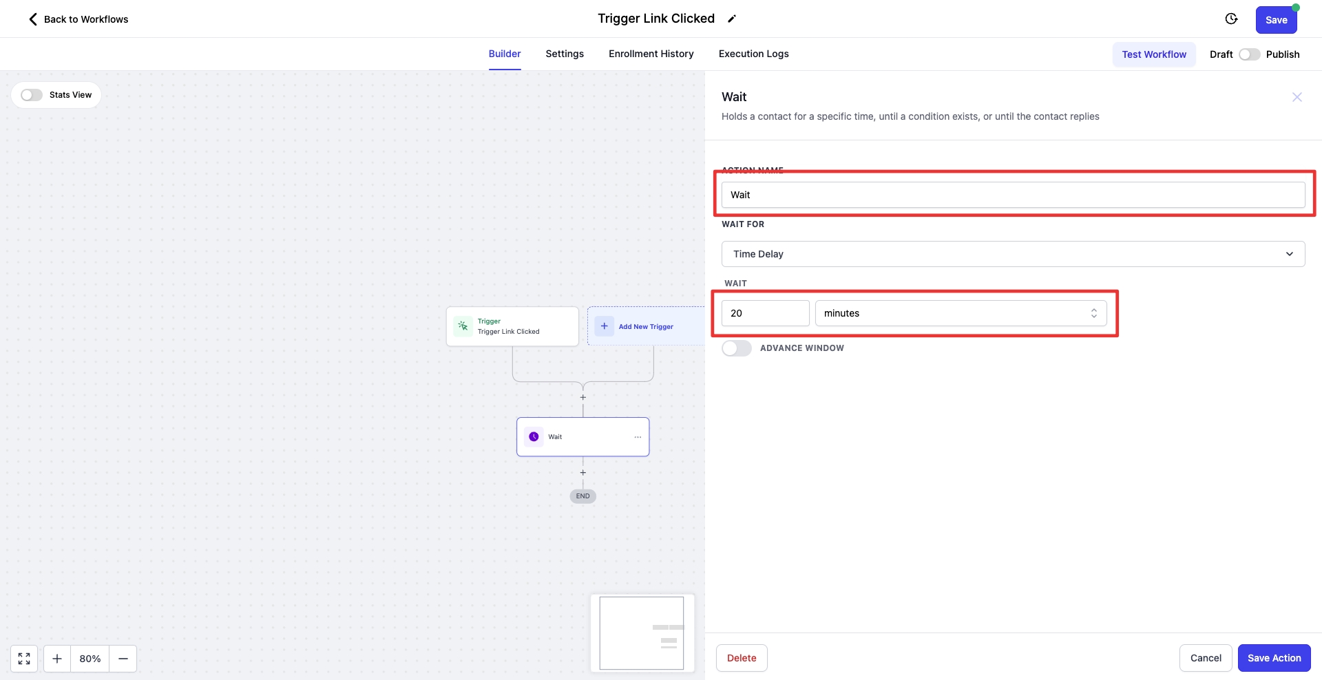 Decide on a waiting period (e.g., 20 minutes) to give leads time to complete the action.