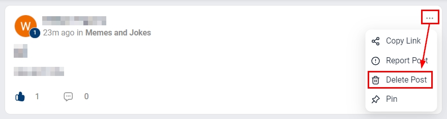 Admins and moderators can delete posts if they violate the terms and conditions by selecting "Delete Post" from the post's menu. Additionally, members can only delete their posts and comments.