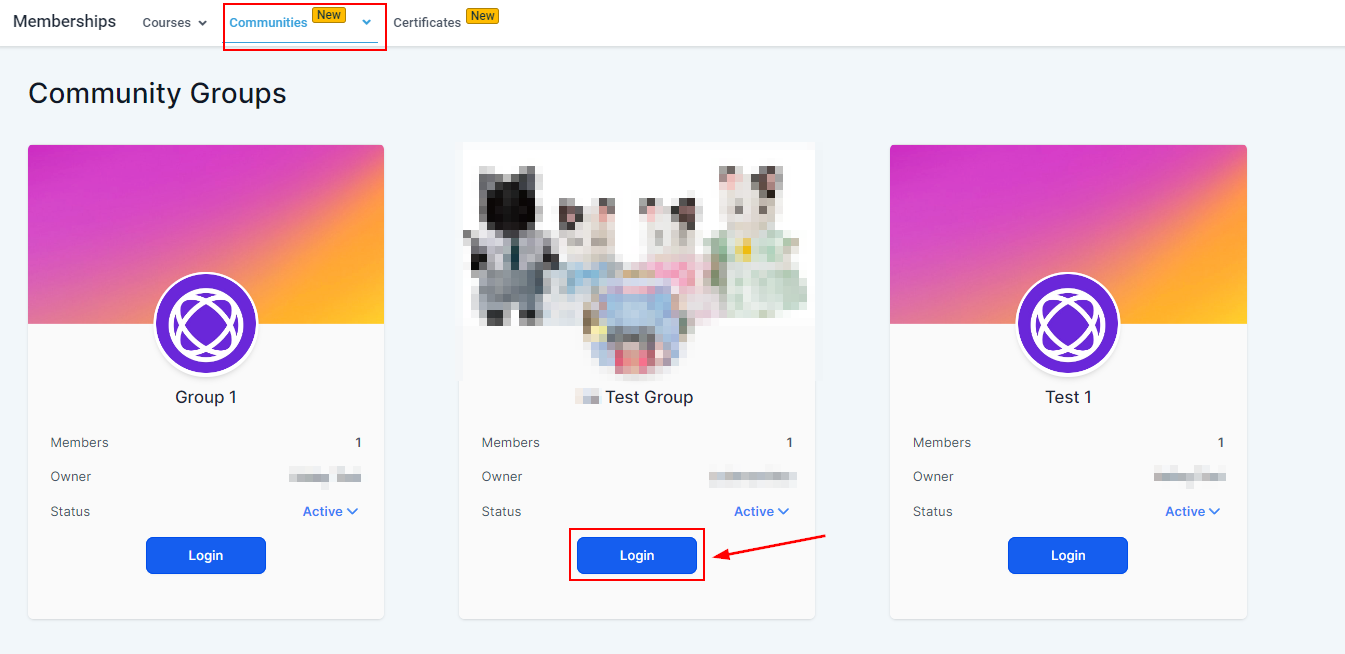 To start accessing your group, if you do not have your group's link saved you can do this by accessing the Community tab inside the Memberships section and clicking the Login button.