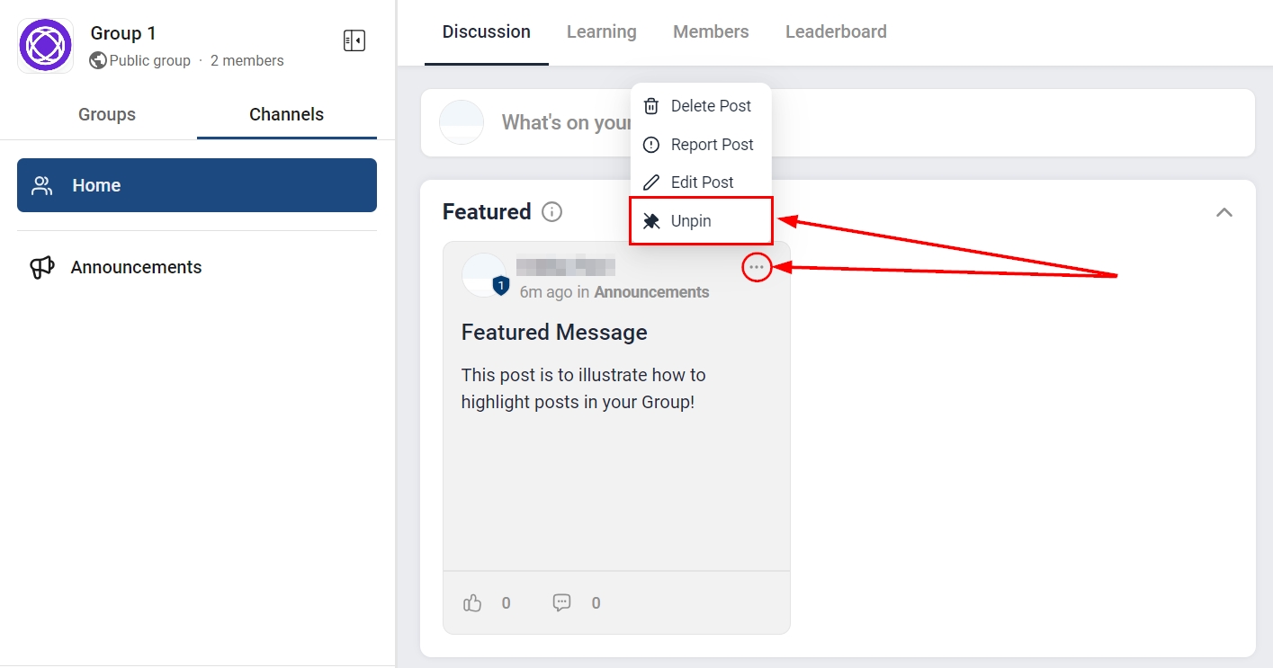 When you designate a post as featured within a specific channel, it will automatically appear at the very top of that channel's content feed. This means that all members visiting the channel will see it as the first item.