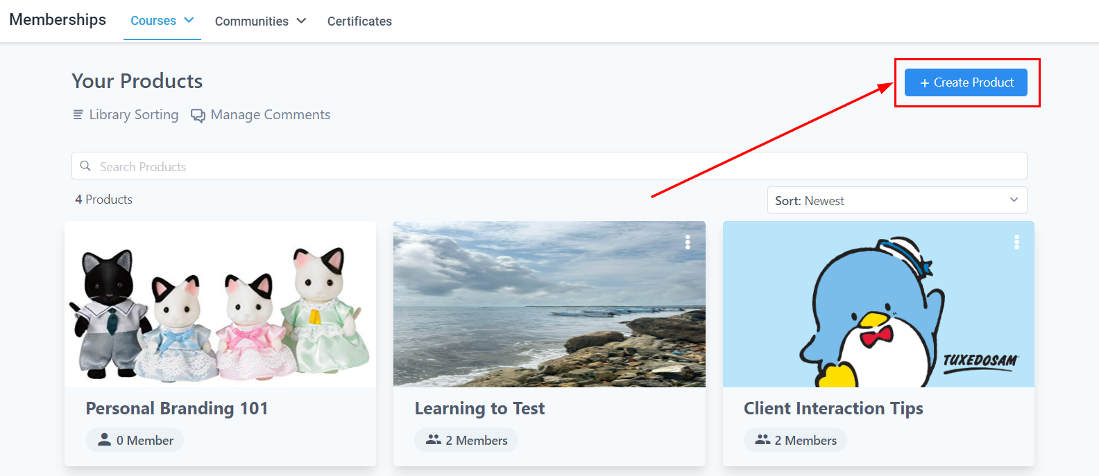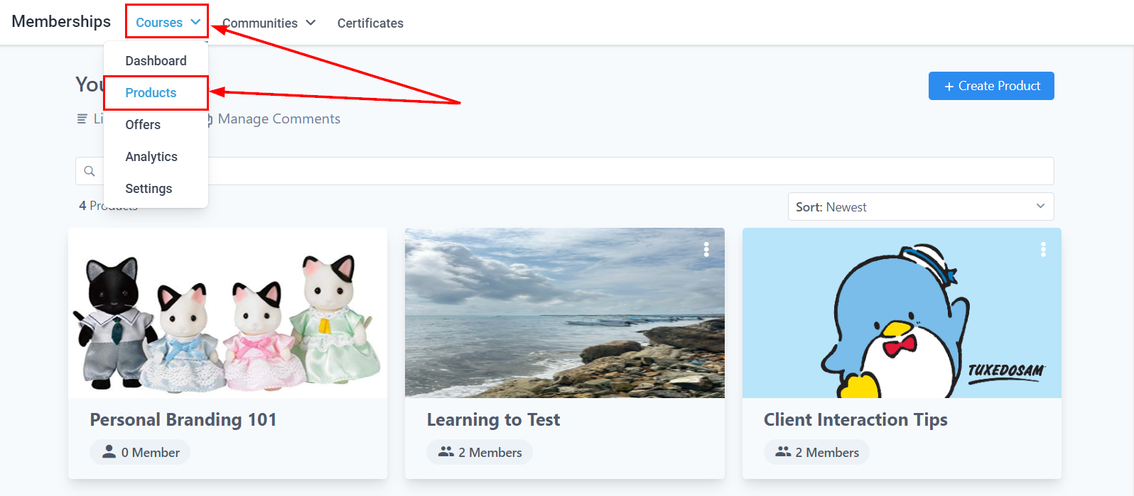 To begin, you need to create a course before adding it to your community. Start by navigating to the 'Membership' section on your dashboard and selecting 'Products' from the Courses dropdown.