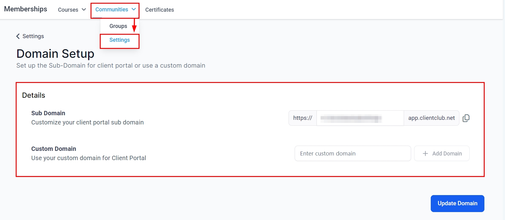 Before you can add courses, ensure you have an active community. Start by setting up a subdomain in your settings or utilize the default domain provided.