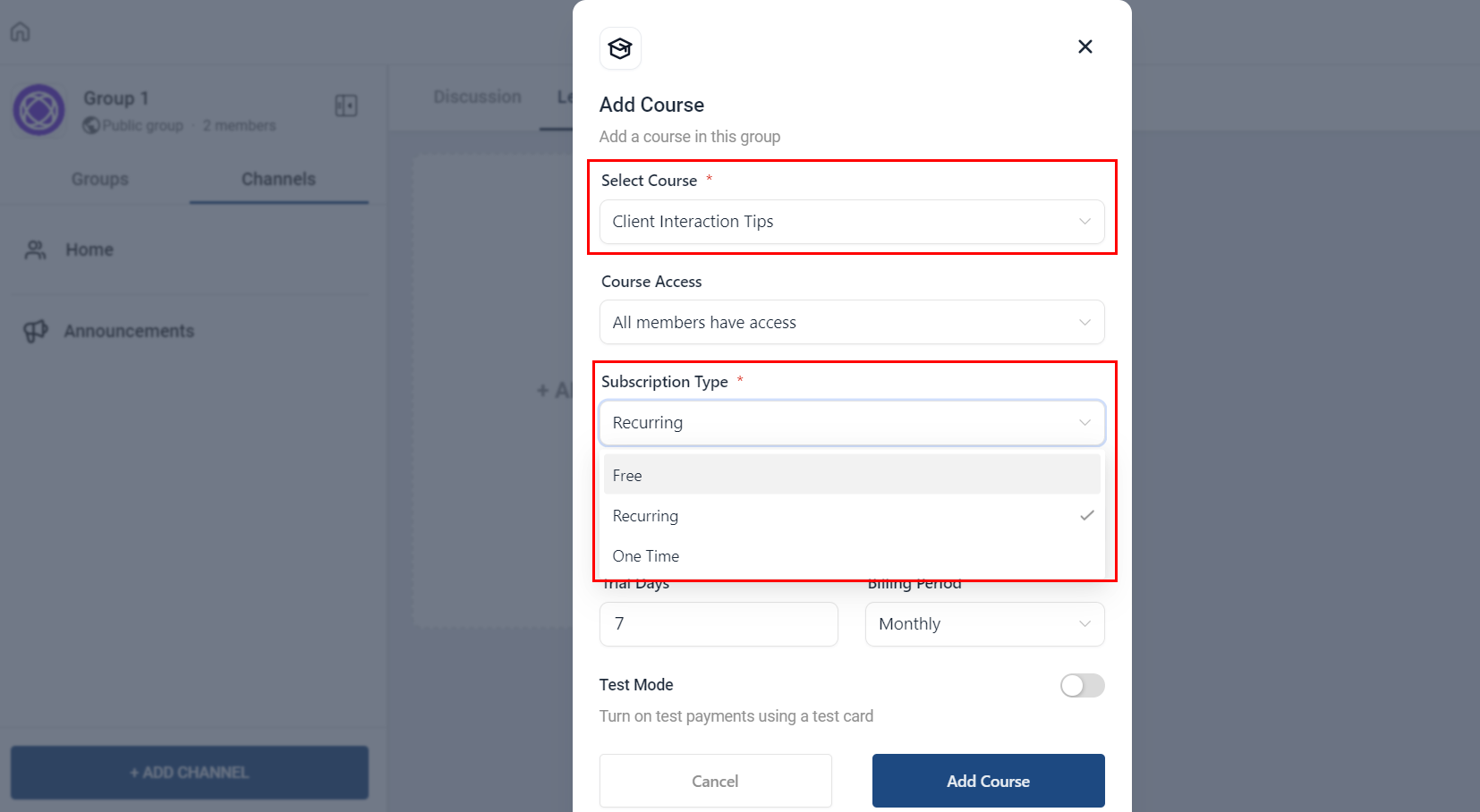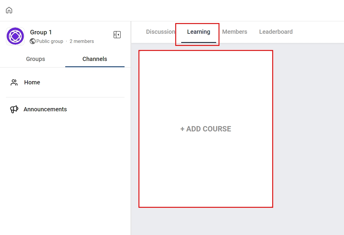 Once your course and community are set up, adding the course to your community is straightforward. Log into your group, navigate to the 'Learning' tab, and click on 'Add Course.'