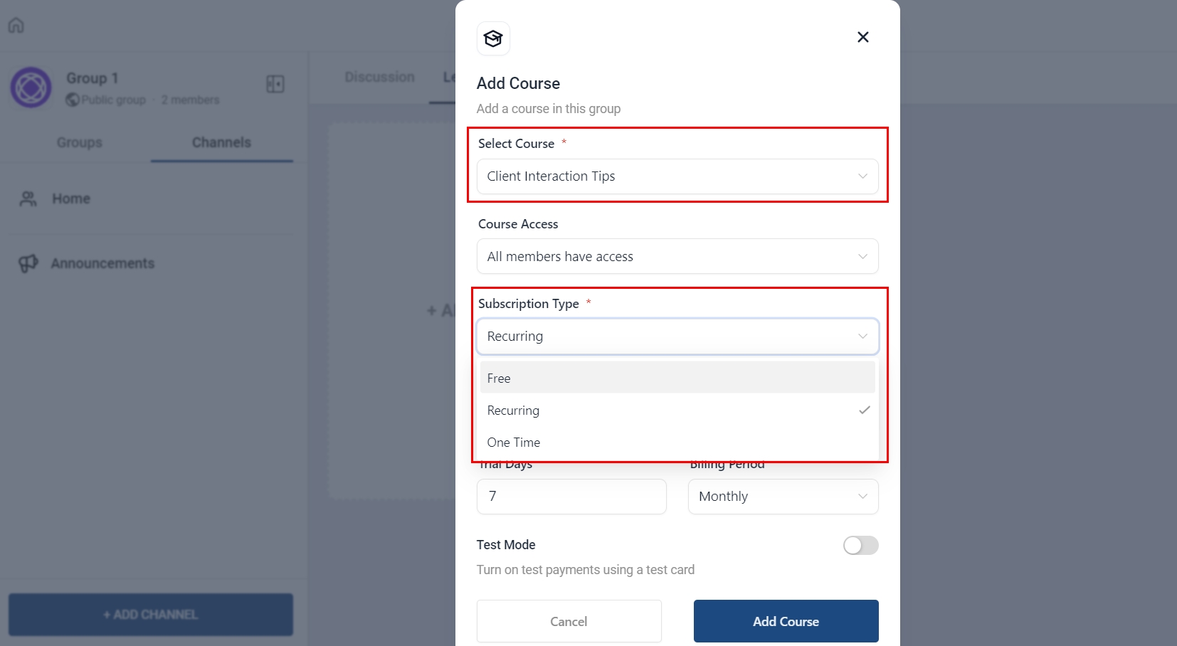 Select your course and set it to 'Free' within the Subscription Type section to make it accessible to all members, providing them with valuable learning resources.