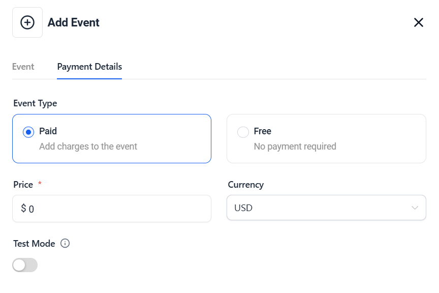 To add charges to the event, select the Paid event type and enter the desired amount in the Price field. Specify the Currency, then toggle the switch to choose between accepting live payments or test payments. If the switch is disabled and appears greyed out, live payments are enabled.