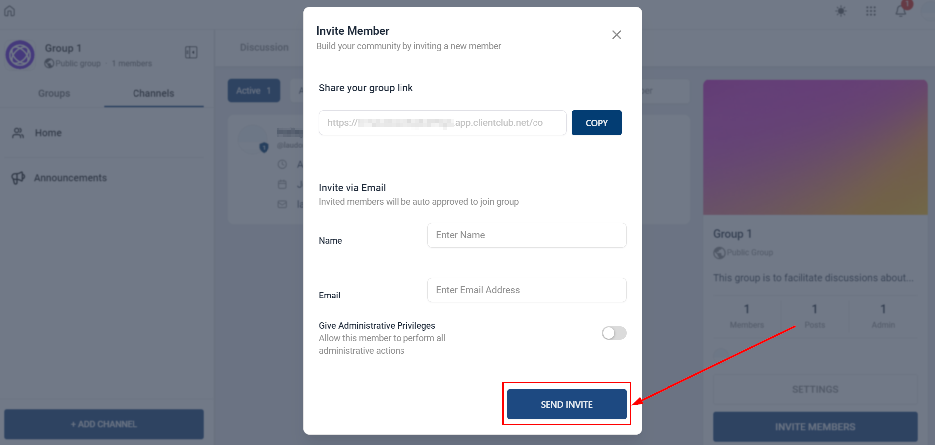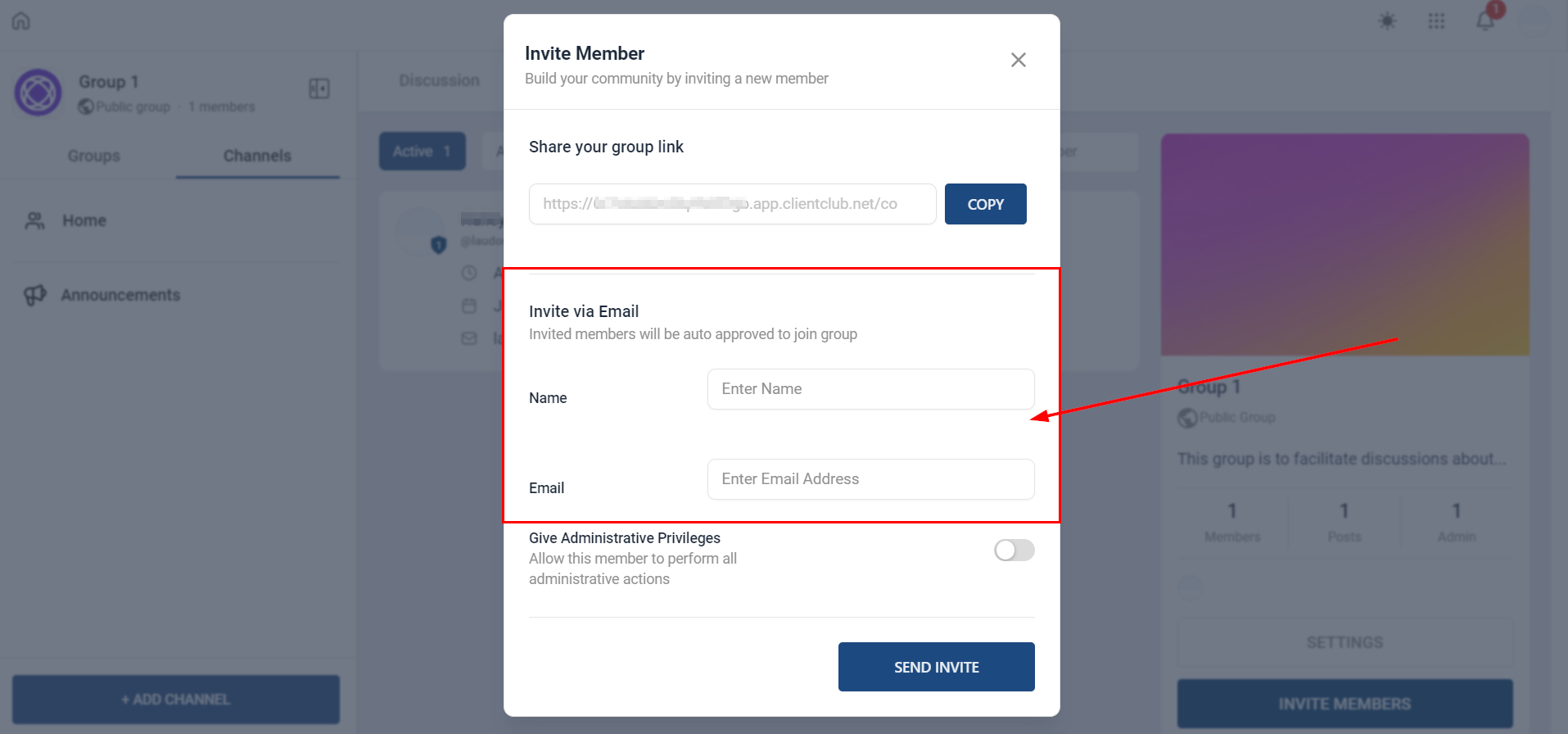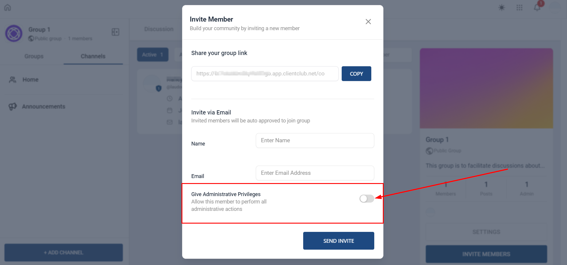 If you are an Admin, you may choose to grant the invited member admin privileges, providing them with greater control and access within the Group.