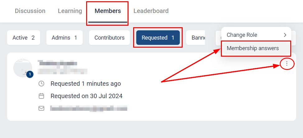 Monitor member responses by navigating to the Members tab and selecting the "Requested" option. In this section, you will find a list of all members who have requested to join. Click the three dots next to a member's name to access their Membership Answers.
