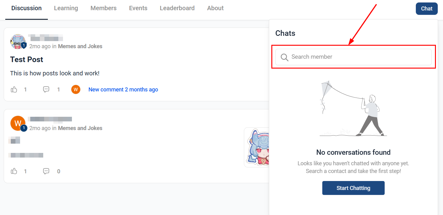 Effective communication is key to building a strong and engaged community. With the Community Chat Feature, you can engage in one-on-one conversations with any community member, whether you're an admin or a regular user. This feature allows for direct communication, fostering connections within your community.