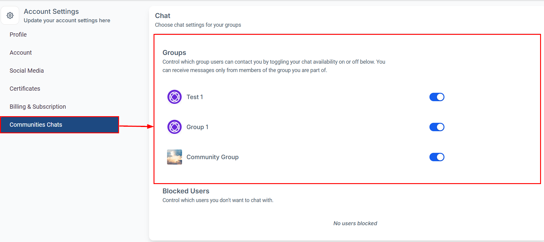 Locate the Community Chats section, and turn off chat for the desired groups.