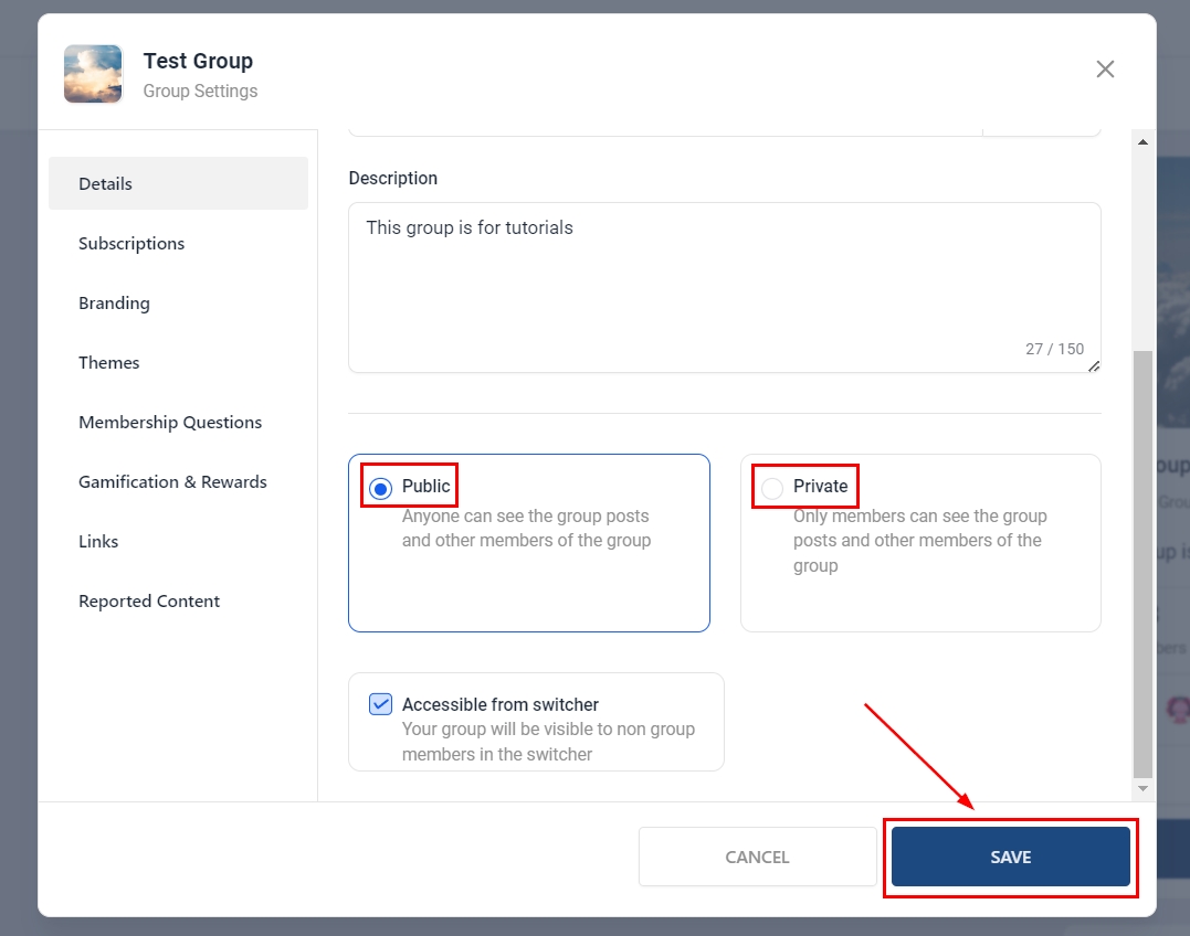 In the Details section, you can switch your group to Public/Private here, select the option, and then click Save.