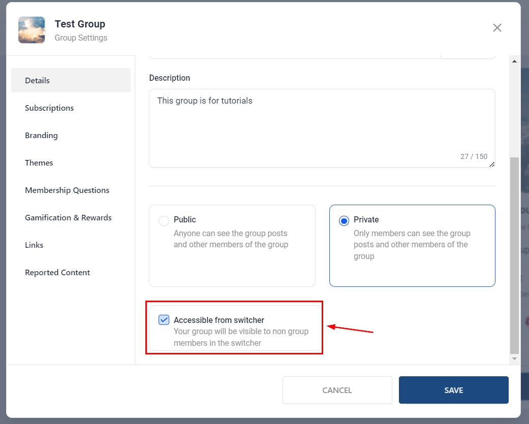 Access for Non-Group Members: You can choose to make the group visible to non-members. This setting controls whether non-members of this group, who have access to other groups in the sub-account, can see your group in the group switcher on the top left or not.