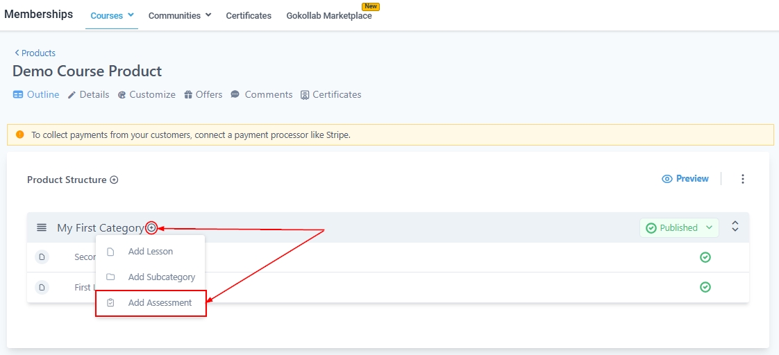 Incorporate assessments into your product to gauge how well learners comprehend the material, providing insight into their knowledge and skills. You can select either a Quiz or an Assignment as the type of assessment. Ensure that you include a title for each!