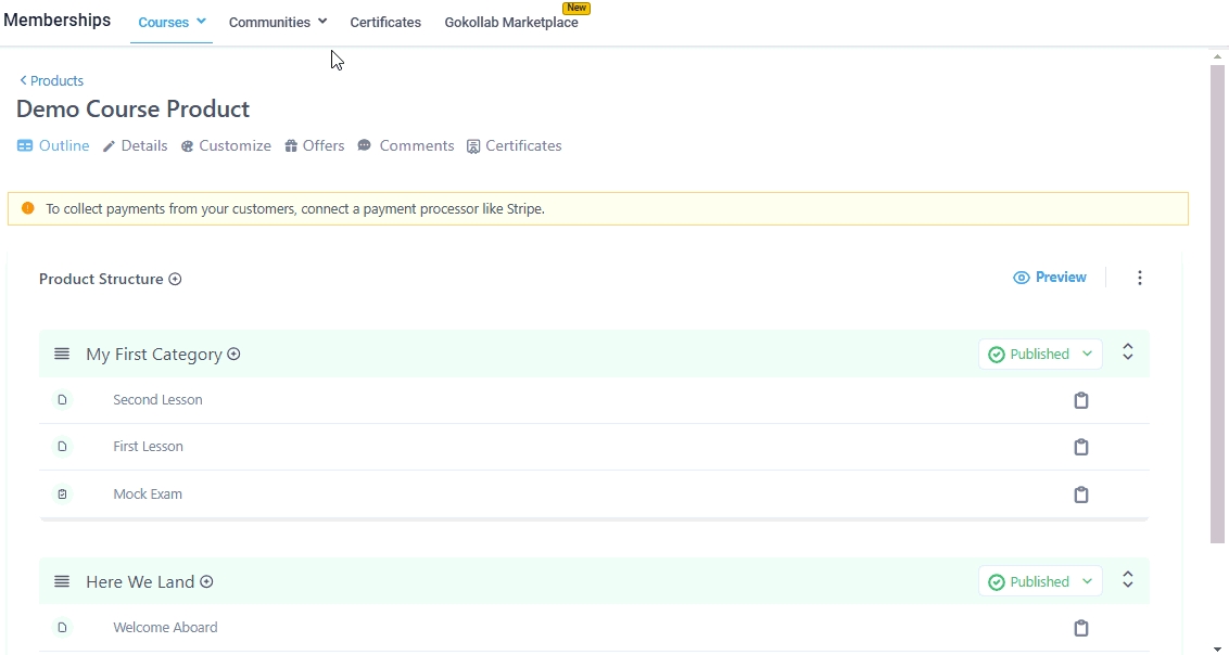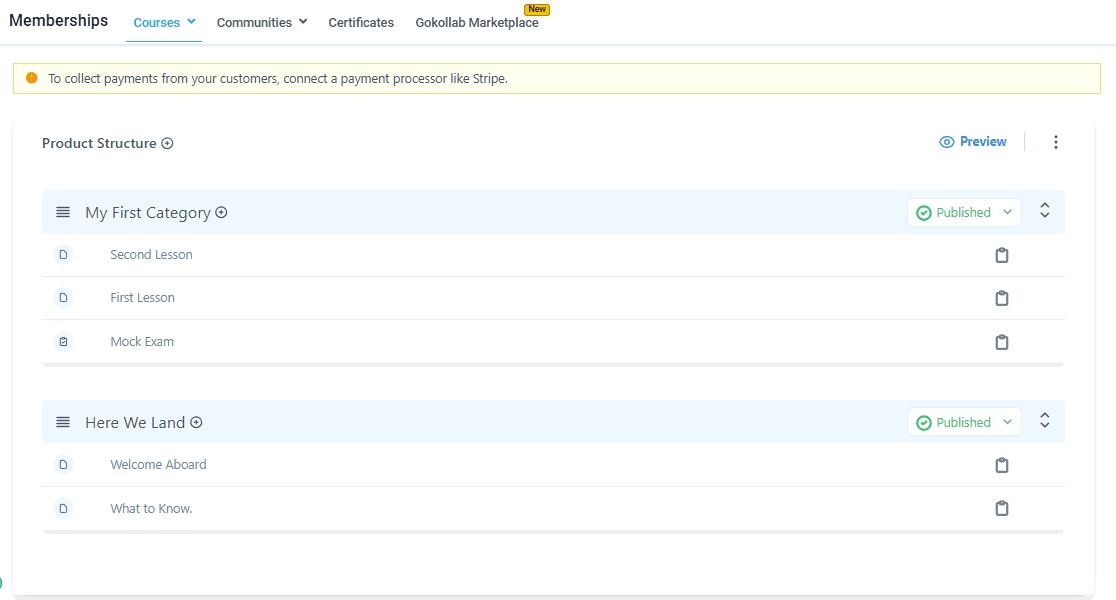 Start by organizing your course into categories or modules, including lessons, subcategories, and assessments.