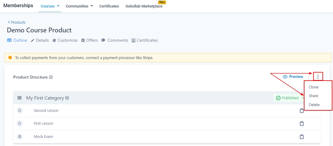 To clone, share, or delete your product, click the three-dot menu next to the Preview button.