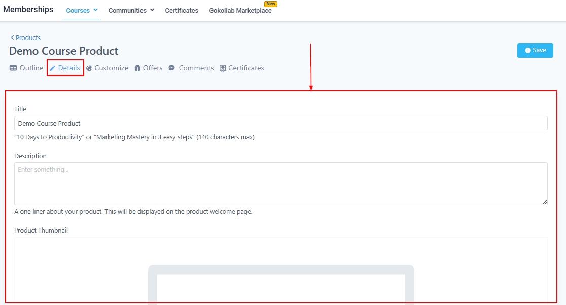 In the “Details” section, you can edit the title, description, thumbnail, and instructor information. You also have the option to add custom code and adjust other core aspects of the course.