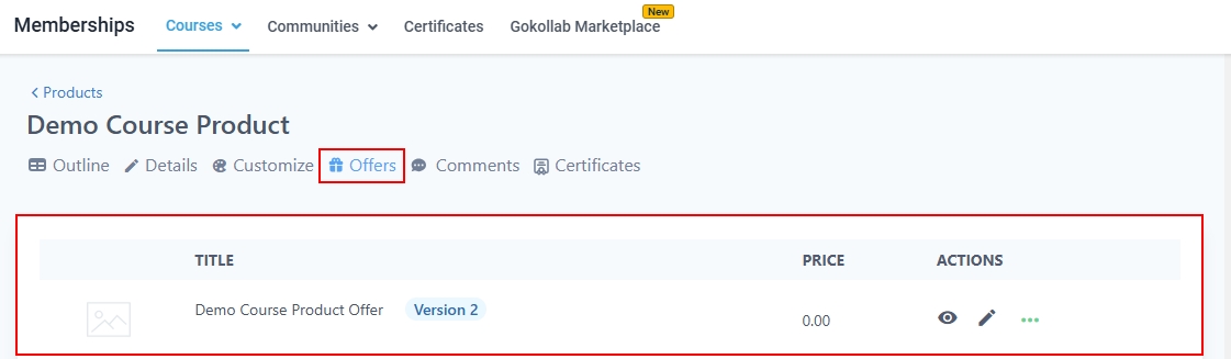 The "Offers" tab allows you to manage course-related offers linked to the product, including titles, prices, and checkout options.