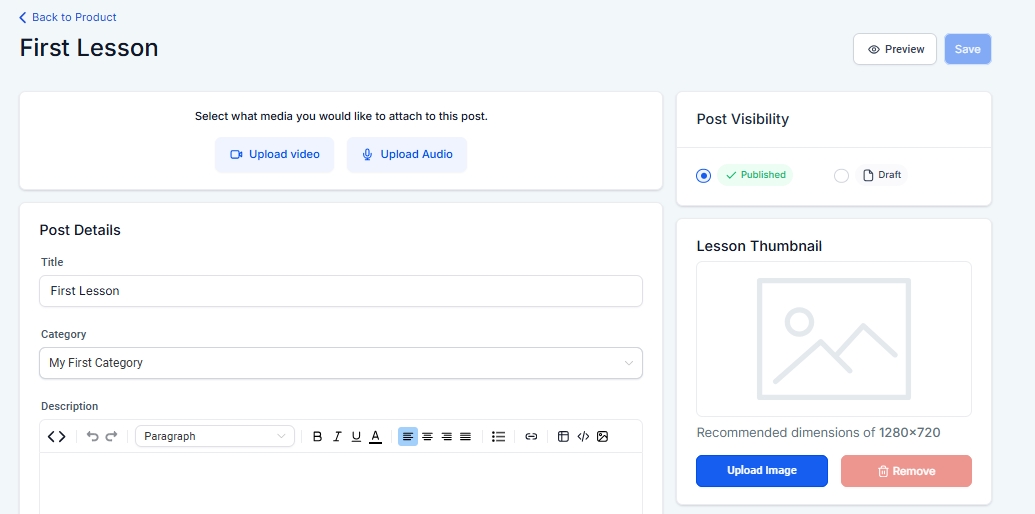 Adding lessons is the core of your content creation, allowing you to include text, images, audio files, and files. You can also adjust settings such as each lesson's title, category, and visibility, ensuring that only published lessons are accessible to students.