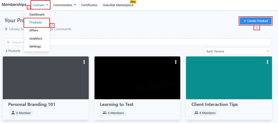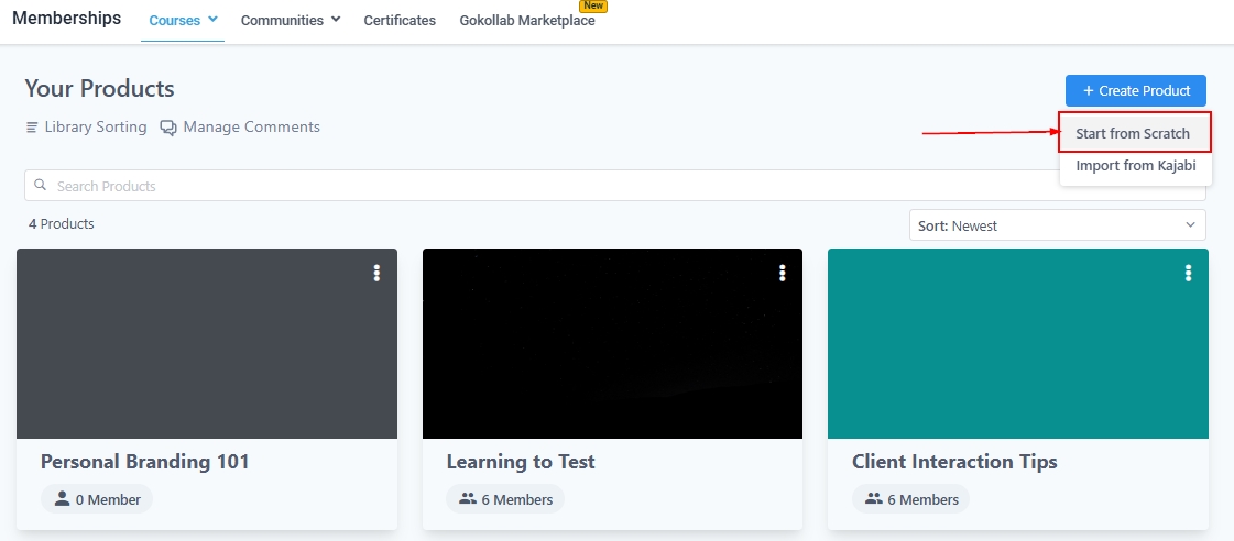 To begin, navigate to the "Memberships" section from the left sidebar. In the Courses dropdown, you will find the "Products" tab, where you can view existing courses or start creating a new one. Selecting "Create Product" allows you to use a pre-designed template or build a course from scratch.