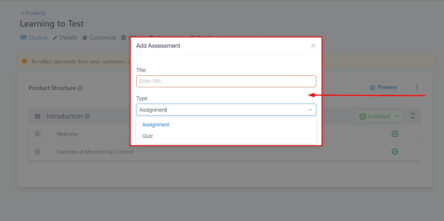 Enter an appropriate name, choose the assessment type, and then click the "Save" button to confirm and finalize the addition. We will select “Quiz” in this guide.