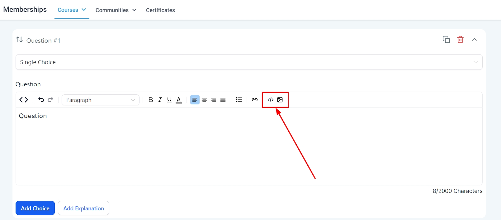 Upload images to questions from your media library or by using a source link. You can adjust the size and aspect ratio of the images.