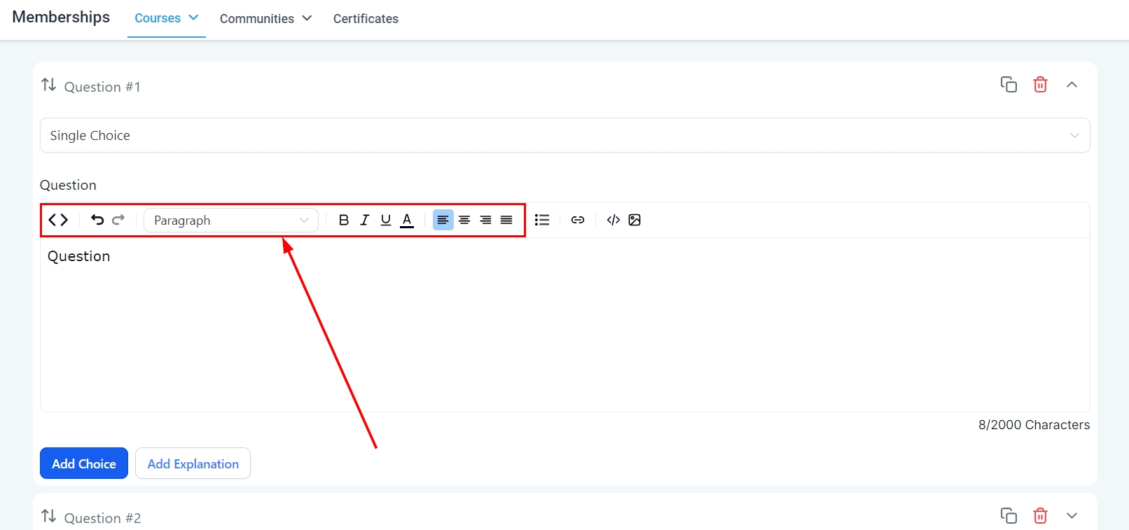 You can choose between single-choice or multiple-choice questions. For each option, you can: