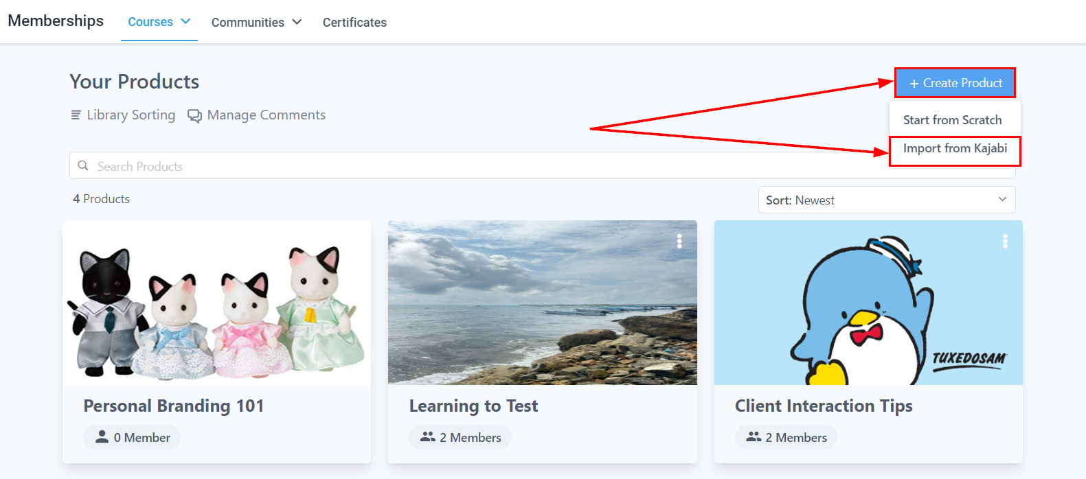 Within your account, navigate to the โProductsโ section within your Membership Area. You can either create a new product from scratch or import an existing course from Kajabi. To proceed, choose the 'Import from Kajabi' option.