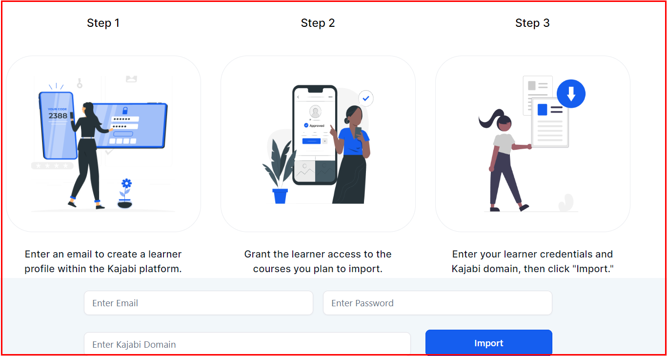Provide the necessary details to facilitate the migration, including the email associated with your Kajabi account, your password, and the Kajabi domain. After entering this information, click 'Import' to begin the process.