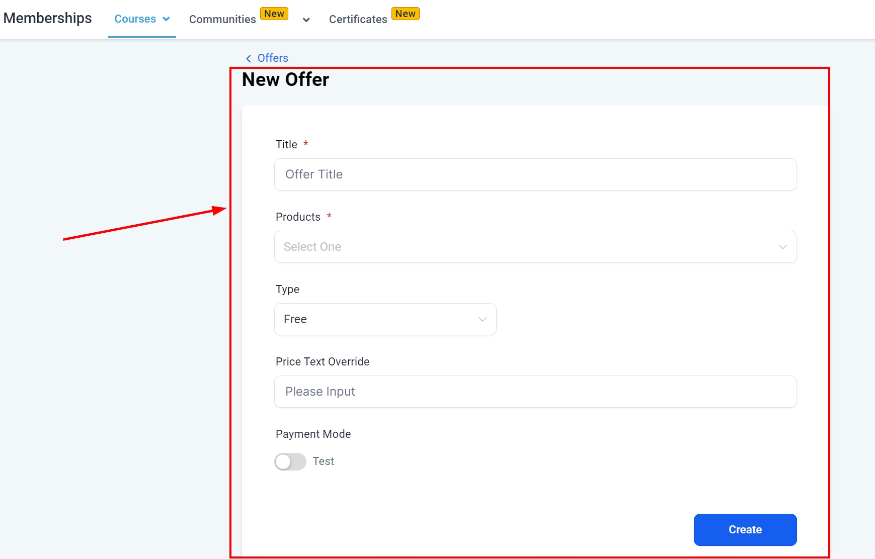 Select "Create Product" at the top right to initiate a new course.