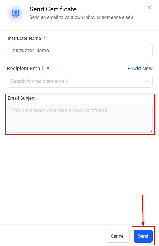 4. Select the recipient's email from your contacts. If you want to send it to someone who has not been added, click the Add New button to input their information. Any custom value you've added to the certificate will be replaced with a blank space if the information is not added already.