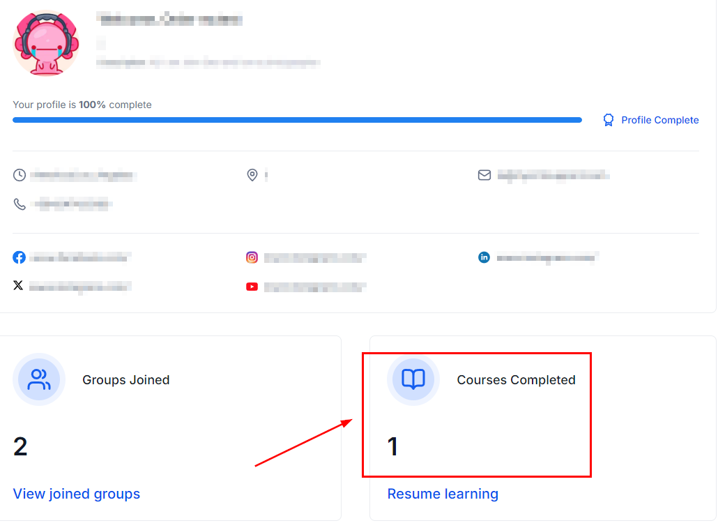 By going to their profile inside the client portal your customers can keep track of their progress and review the total courses they've completed.