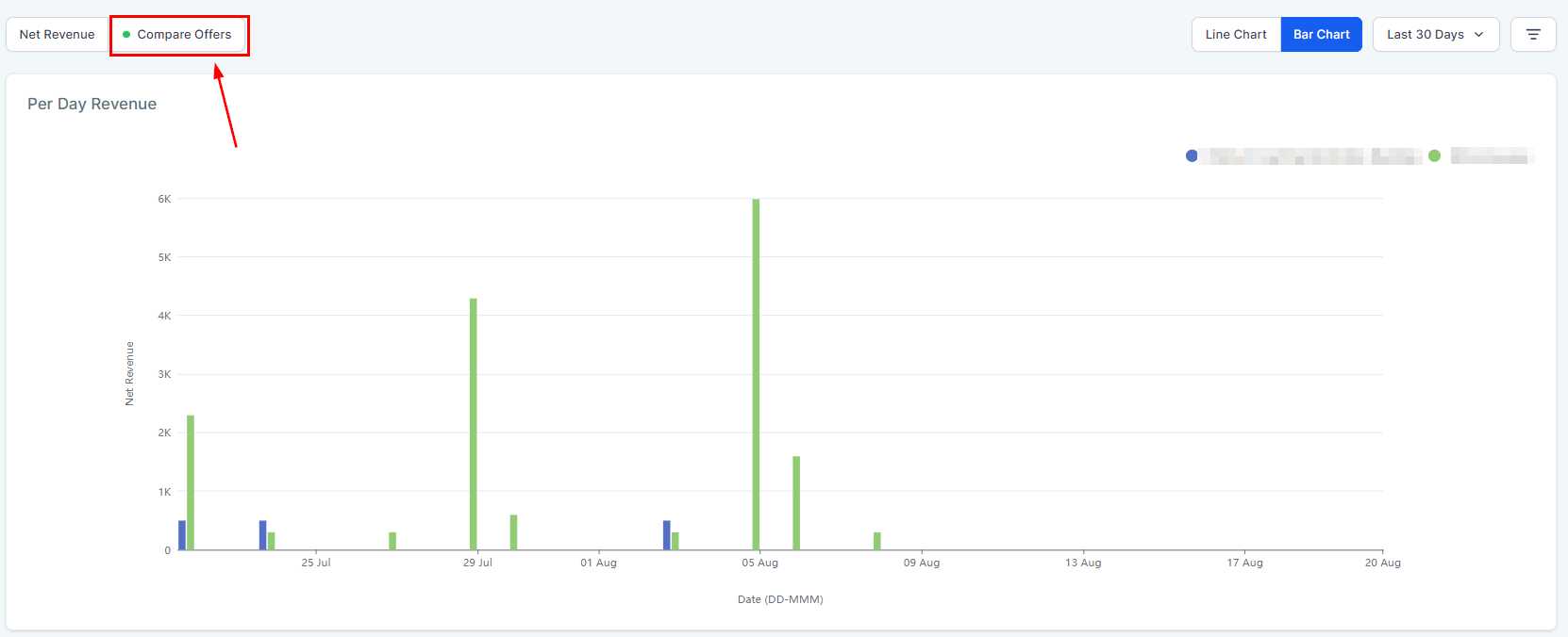 This will deal with data from all offers as a whole, this information is separated into two main graphs. Per Day Revenue which shows your day-to-day total revenue.
