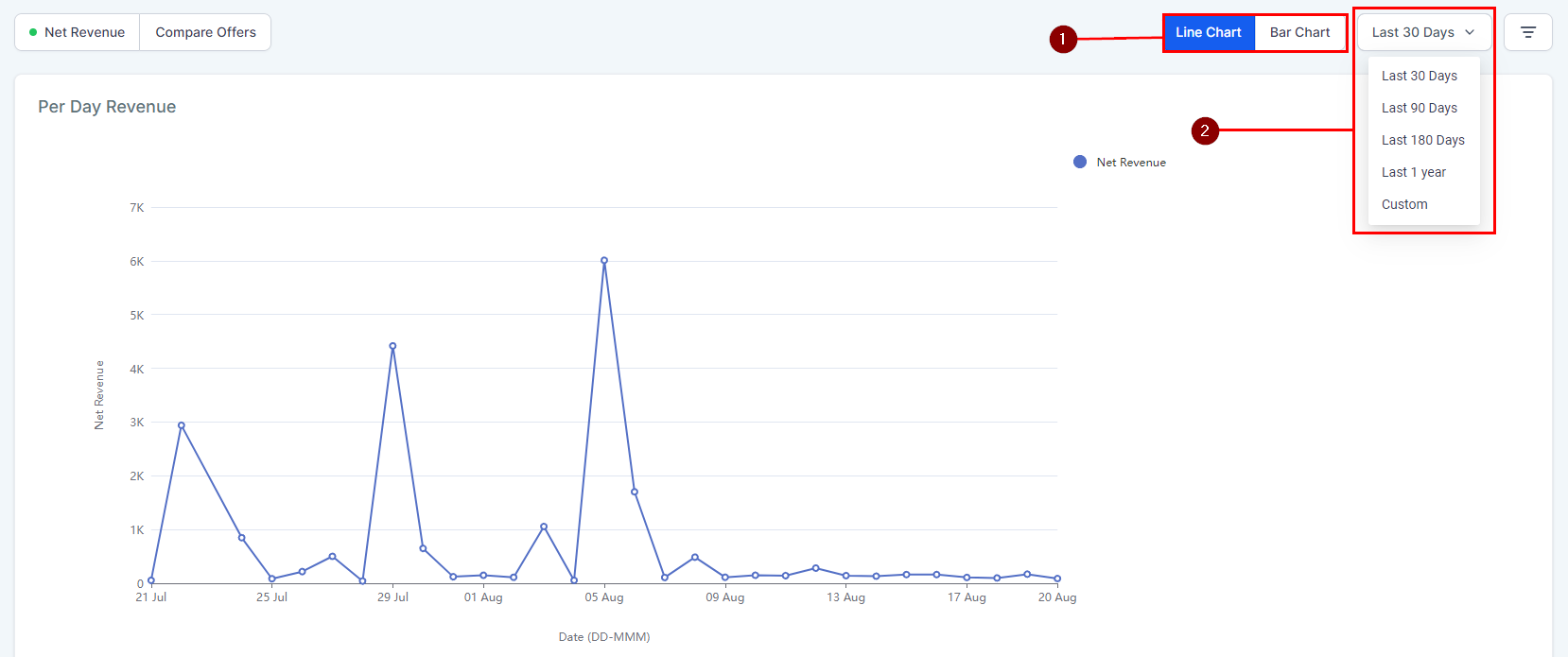 You can change the way the graphs are displayed (1) and the days covered (2) to better understand and convey the revenue information.
