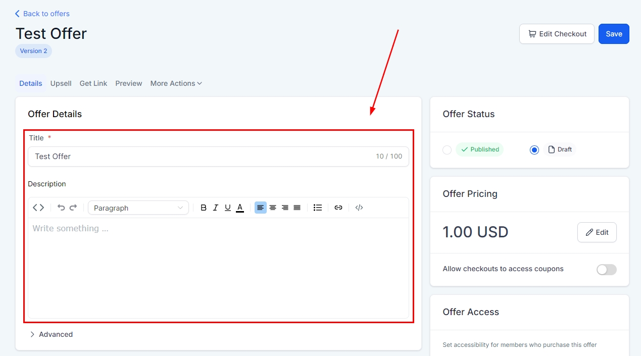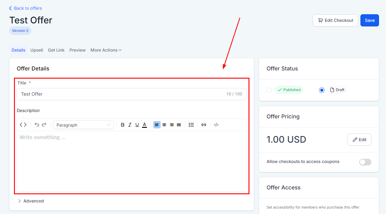 Here you can customize how the Offer is presented, you can add videos, and check the Checkout Copy.