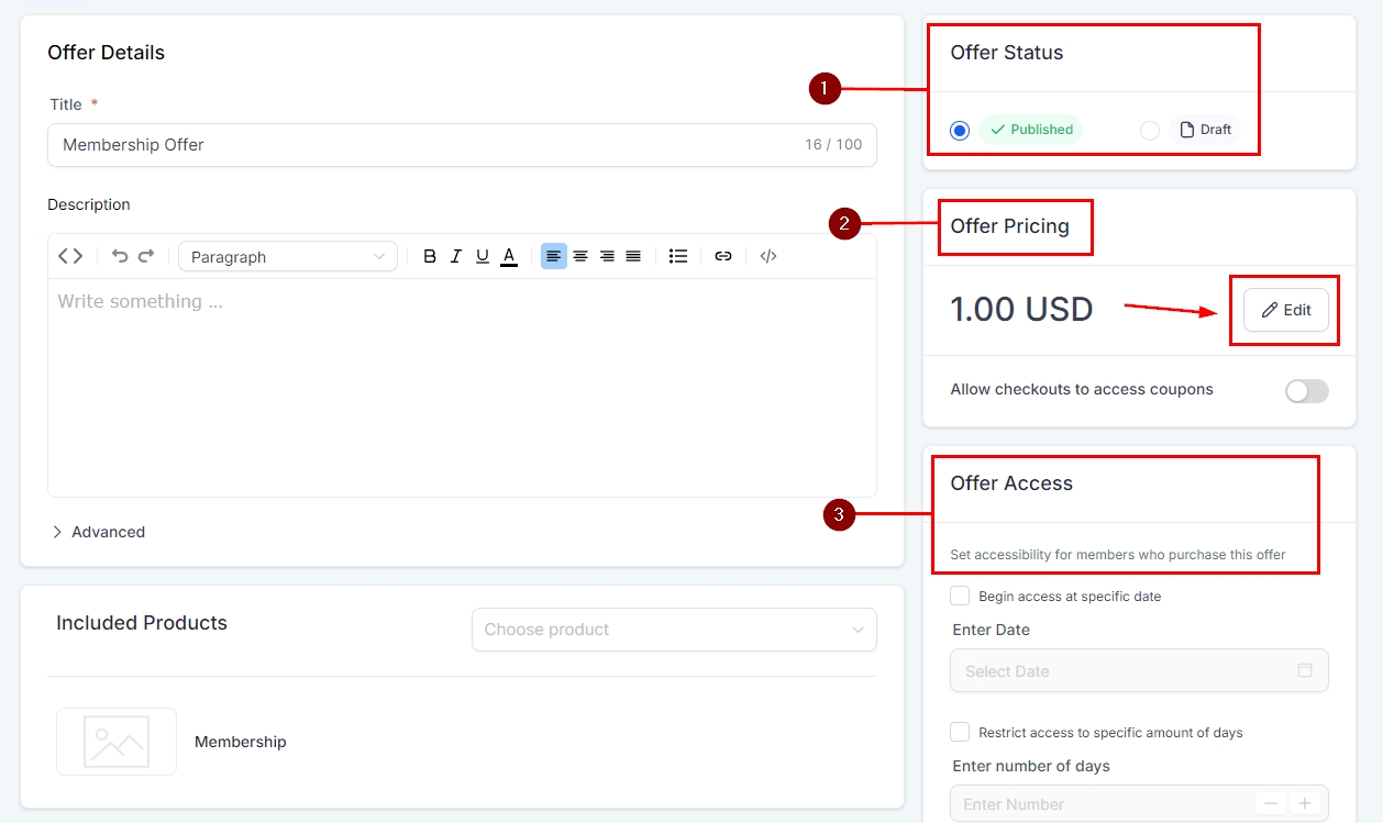 Offer Access: This allows you to manage the start and end of the customer's access to the product