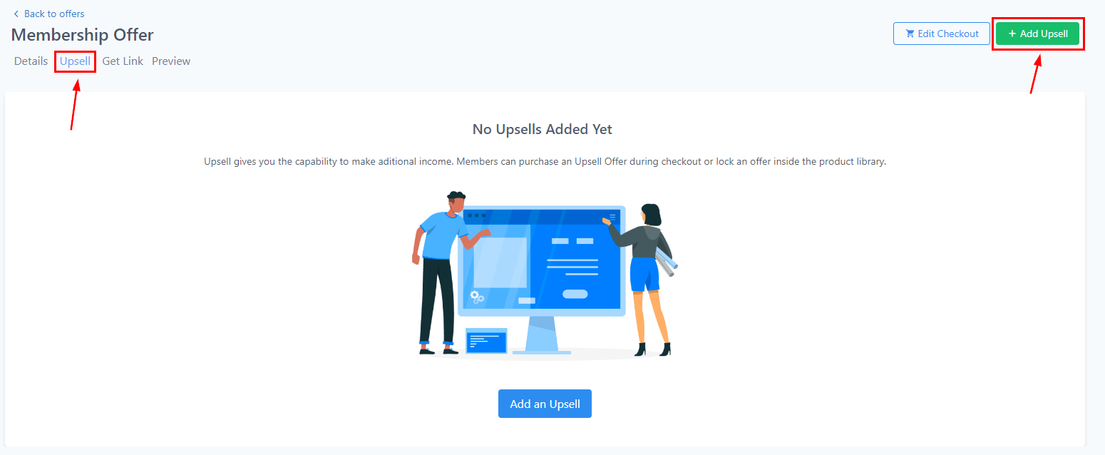 You can use upsells to generate additional income using one-click deals directly after the first purchase is made. It gives you the capability to add an optional offer that members can purchase during checkout. The upsell checkout page will be prompted after the initial offer is purchased. Simply click on "Add an Upsell" if you want to add one.