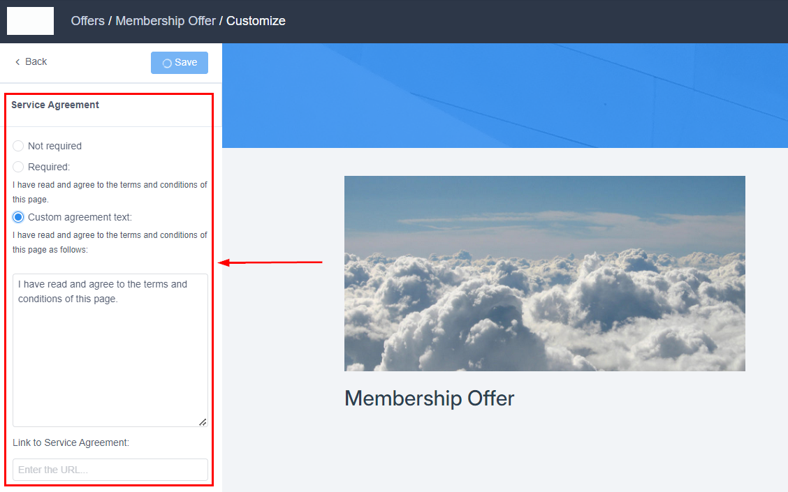 Select Custom agreement text to add your desired terms and conditions.