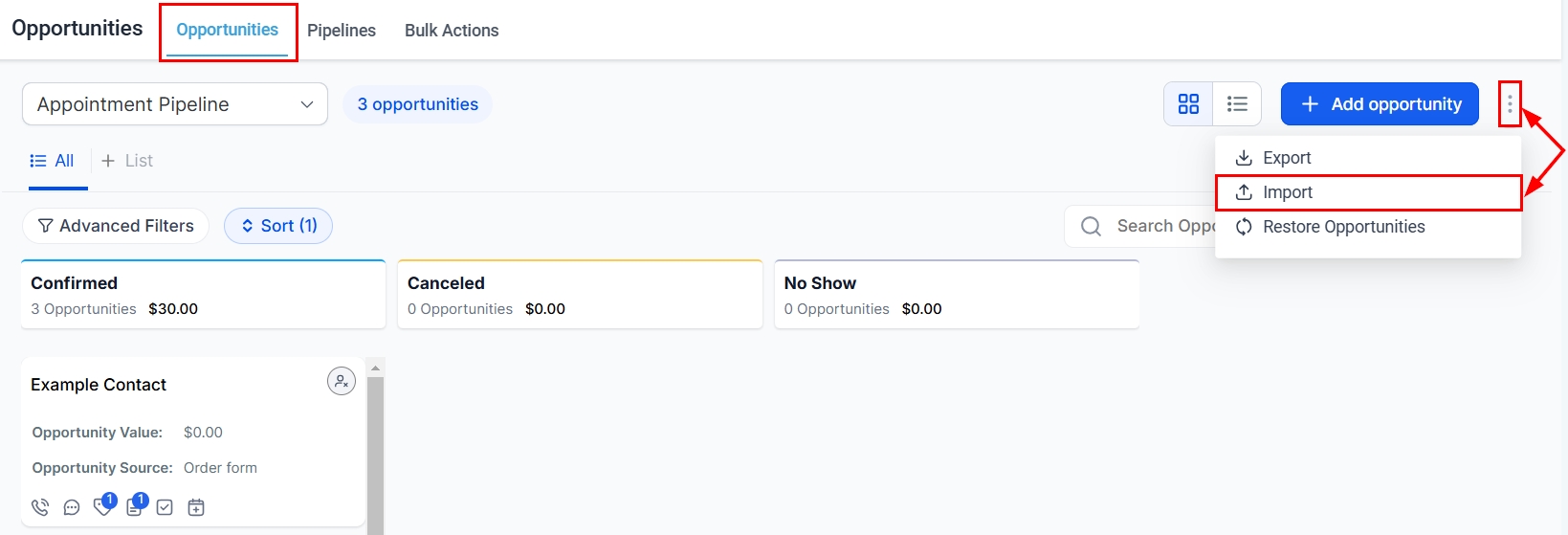 In the Opportunities section, open the options menu (three dots) and select "Import."