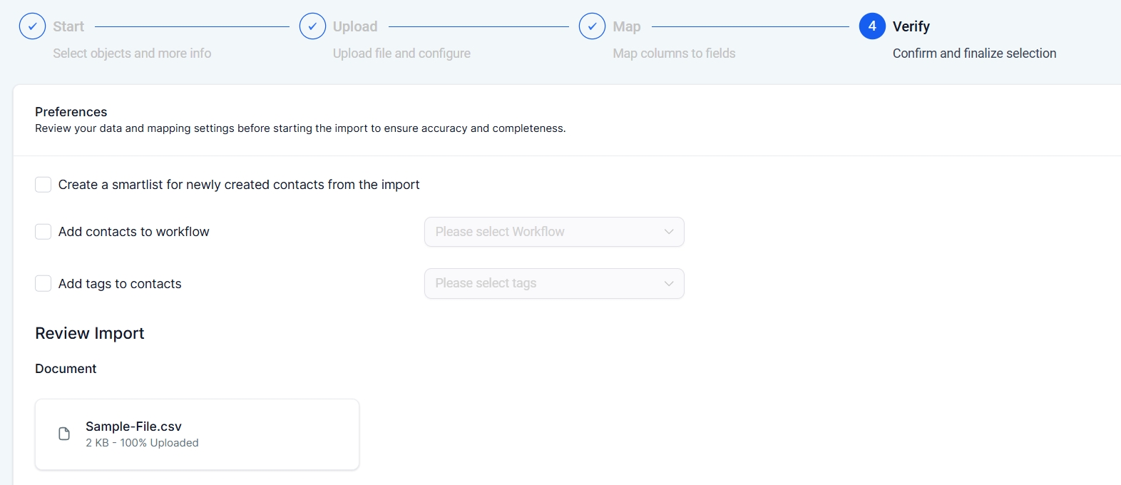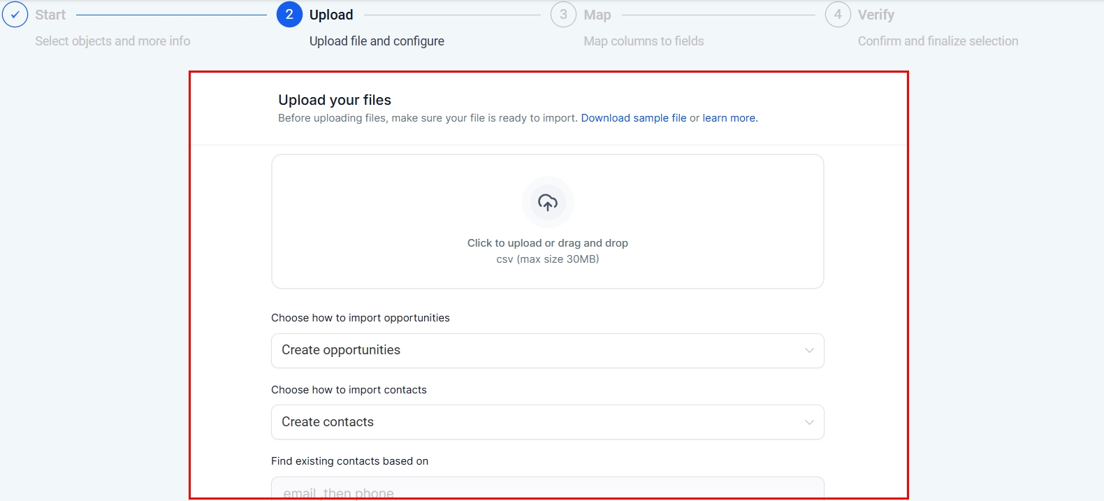 Map fields in your CSV to the relevant fields in the system (for Contacts or Opportunities) to ensure accuracy.