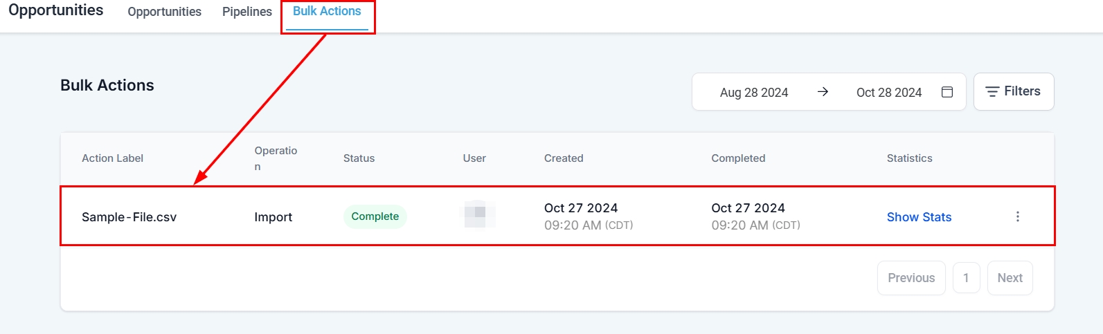 Track the import process under the Bulk Actions tab in Opportunities. Here, you can view progress, download error logs, and resolve any issues.