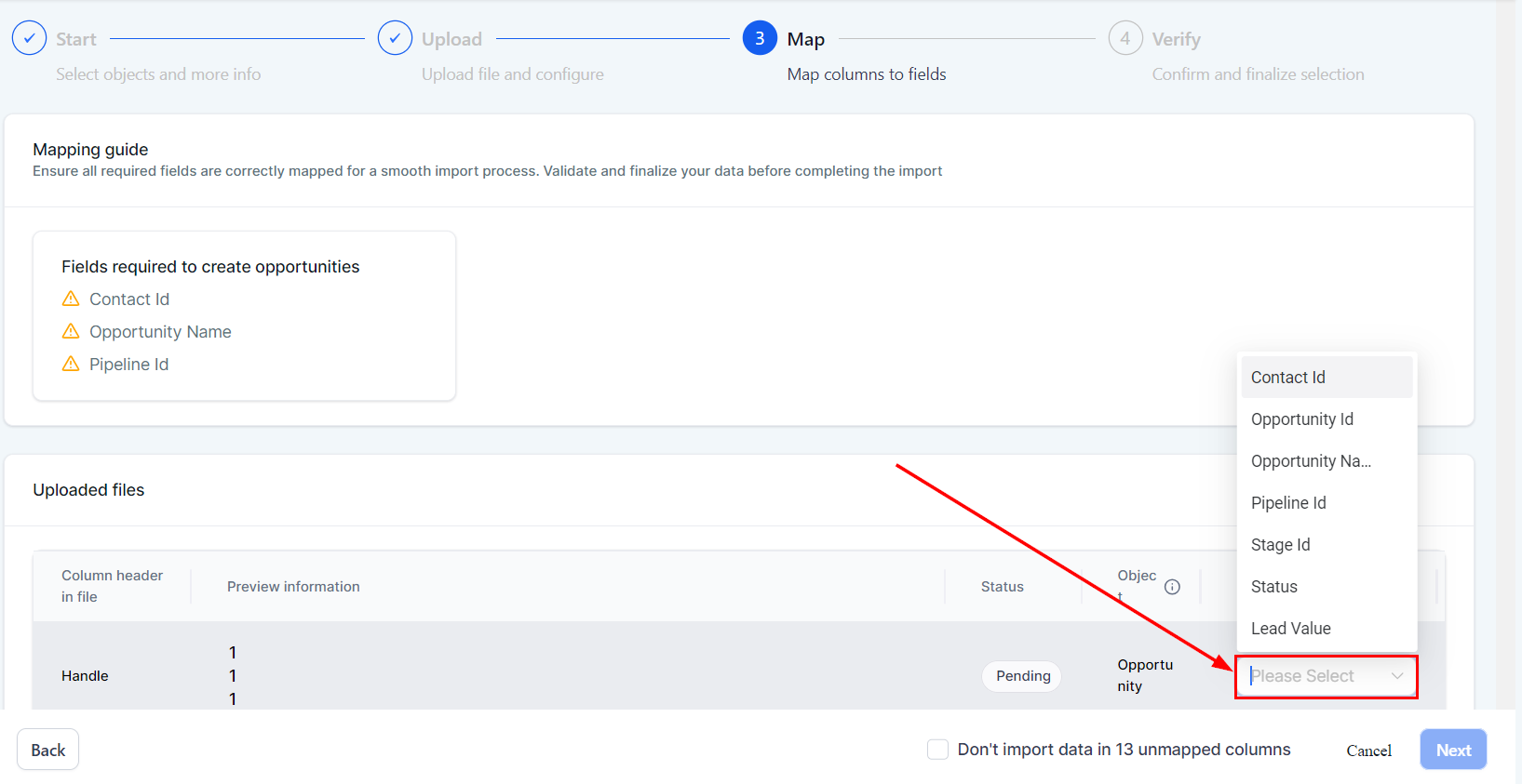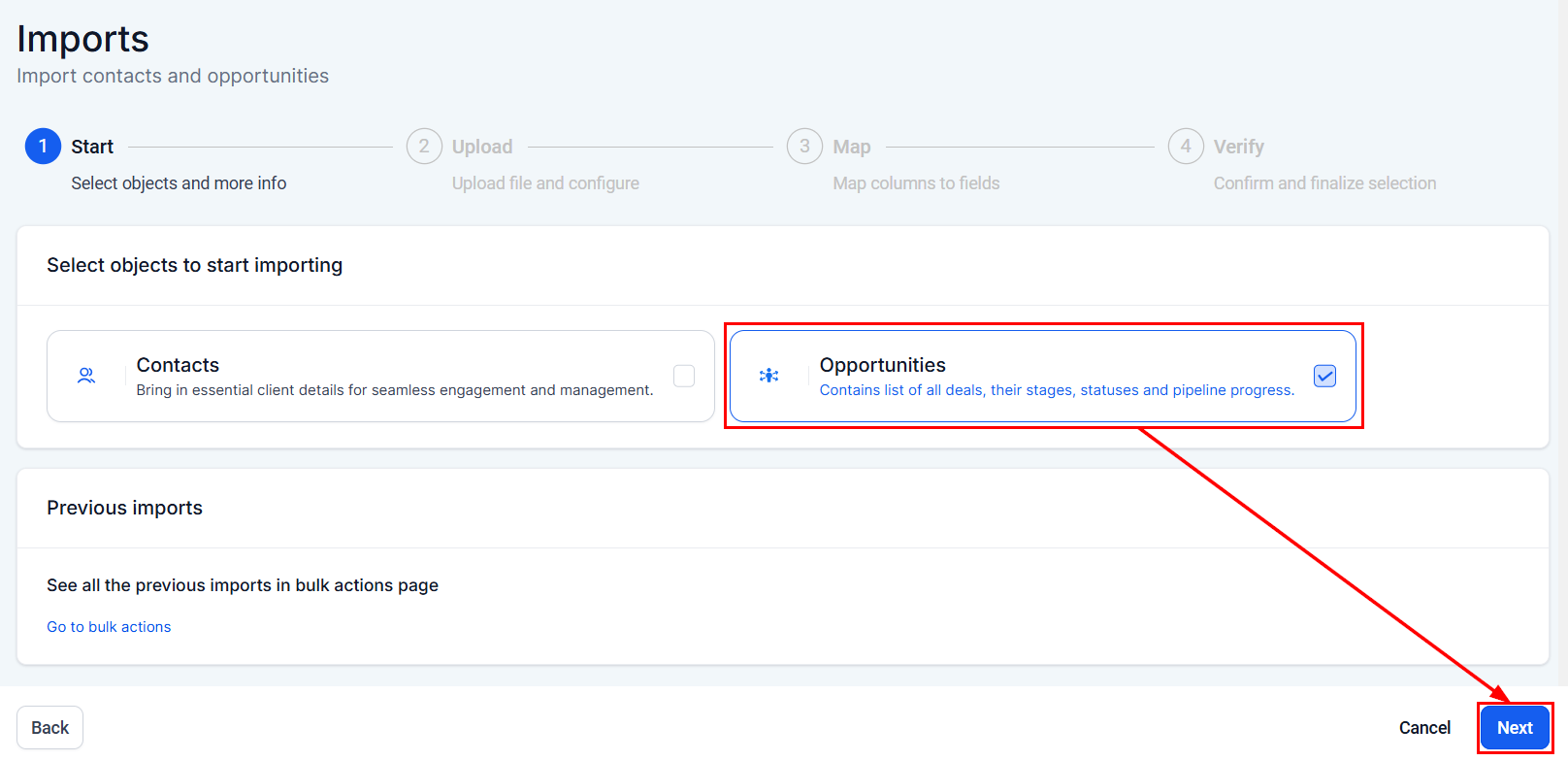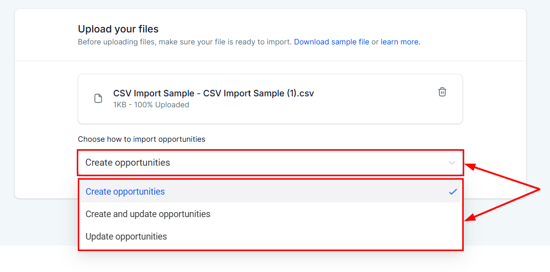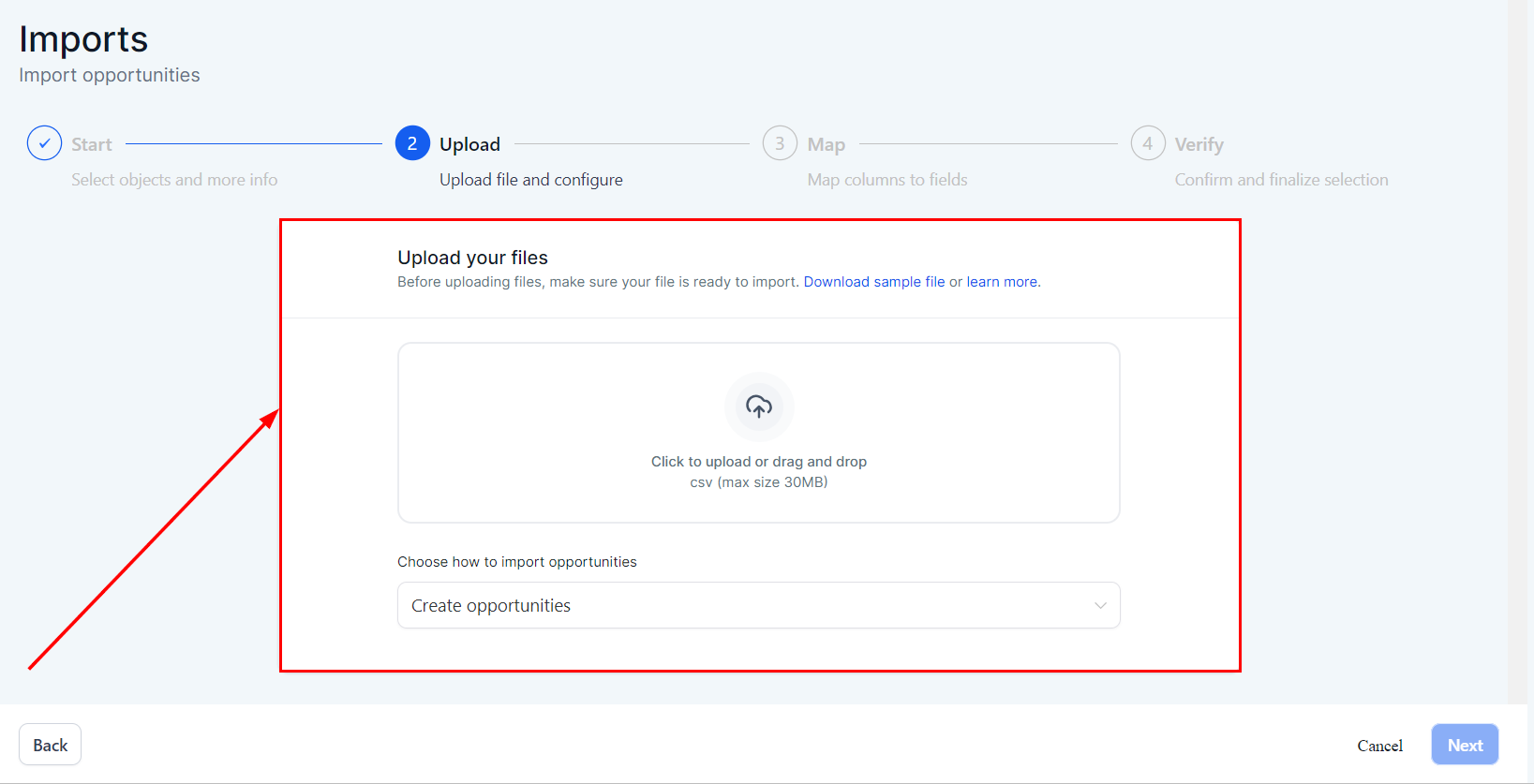 Importing files into the system is simple when following the steps outlined below. While contacts and opportunities can be imported simultaneously, this guide is dedicated to the opportunity import process. By following this article, you will ensure a smooth and effective import, enabling seamless management of opportunities within the platform.