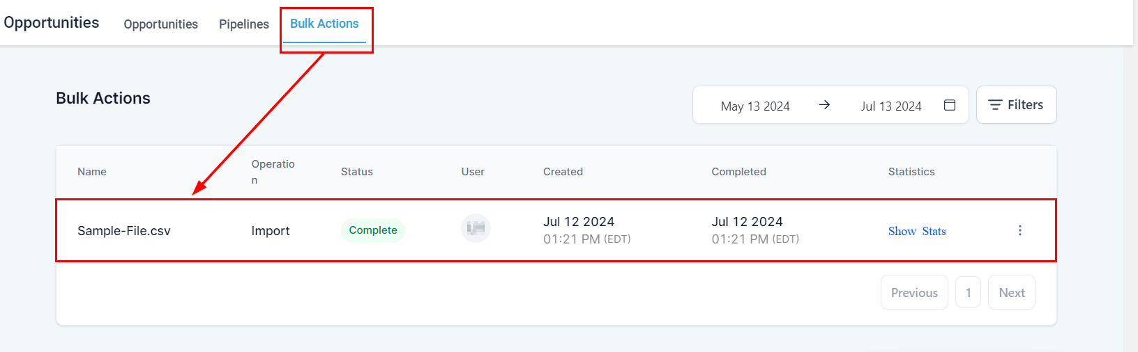 To monitor the progress of an import, go to Opportunities > Bulk Actions and locate the action within the list. Apply filters or select the desired date range if necessary.