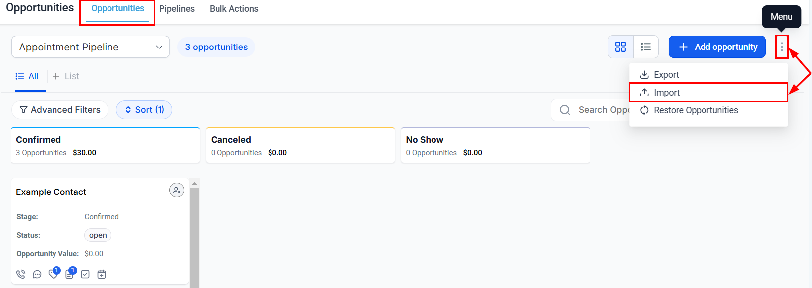 Navigate to the Opportunities tab from the left sidebar. In the upper-right corner, click on the three dots and select “Import.”