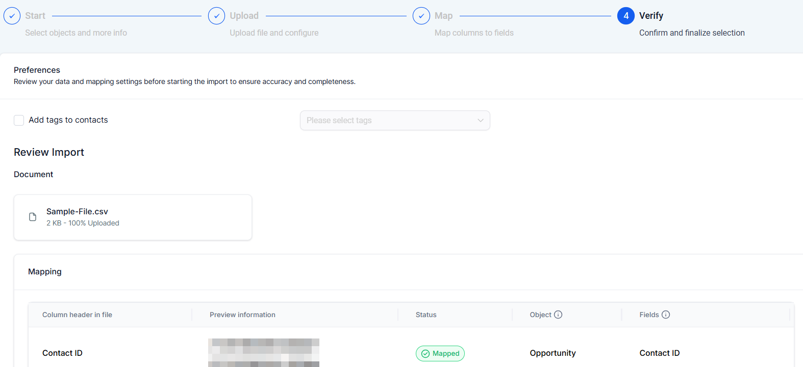 Review the data preview to ensure everything looks correct. You can also add tags to the corresponding contacts for these opportunities on this screen.