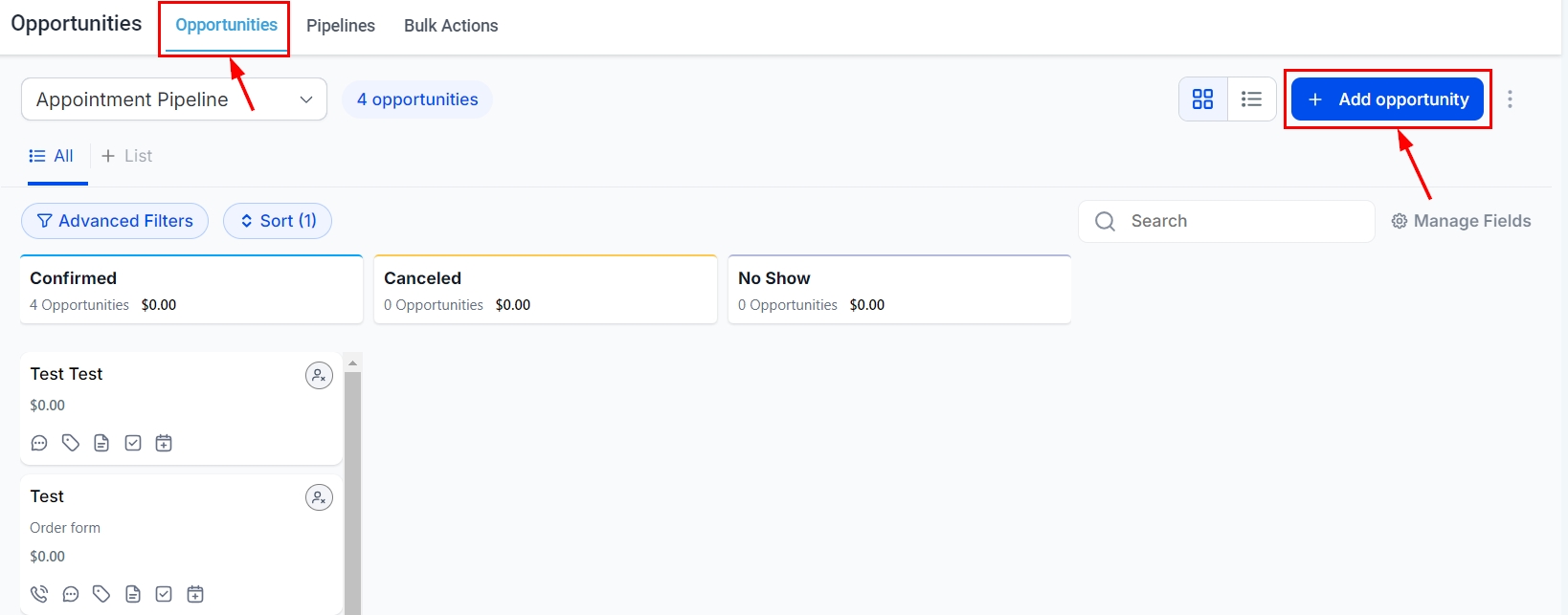 To commence the creation of a new opportunity, head to the Opportunities section from your account Dashboard, then click the “+ Add Opportunity” button.