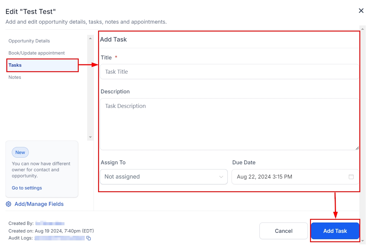 If you would like to manually add a new task for a specific opportunity, you can do so here.